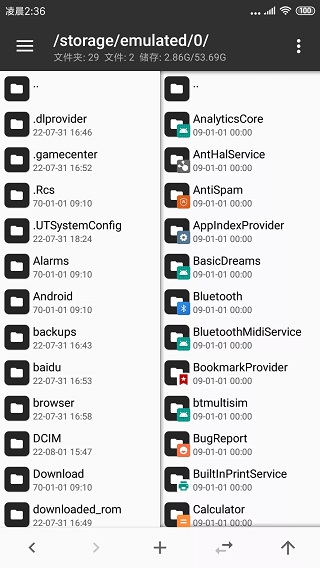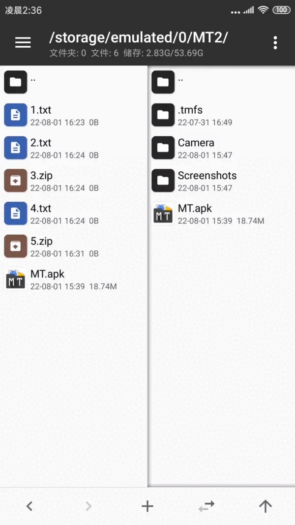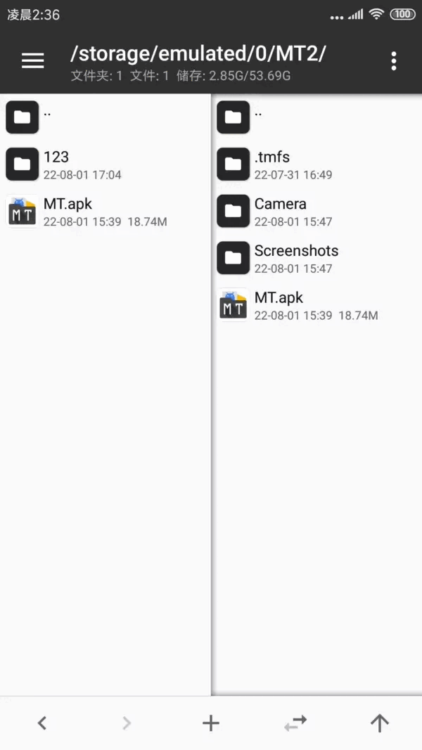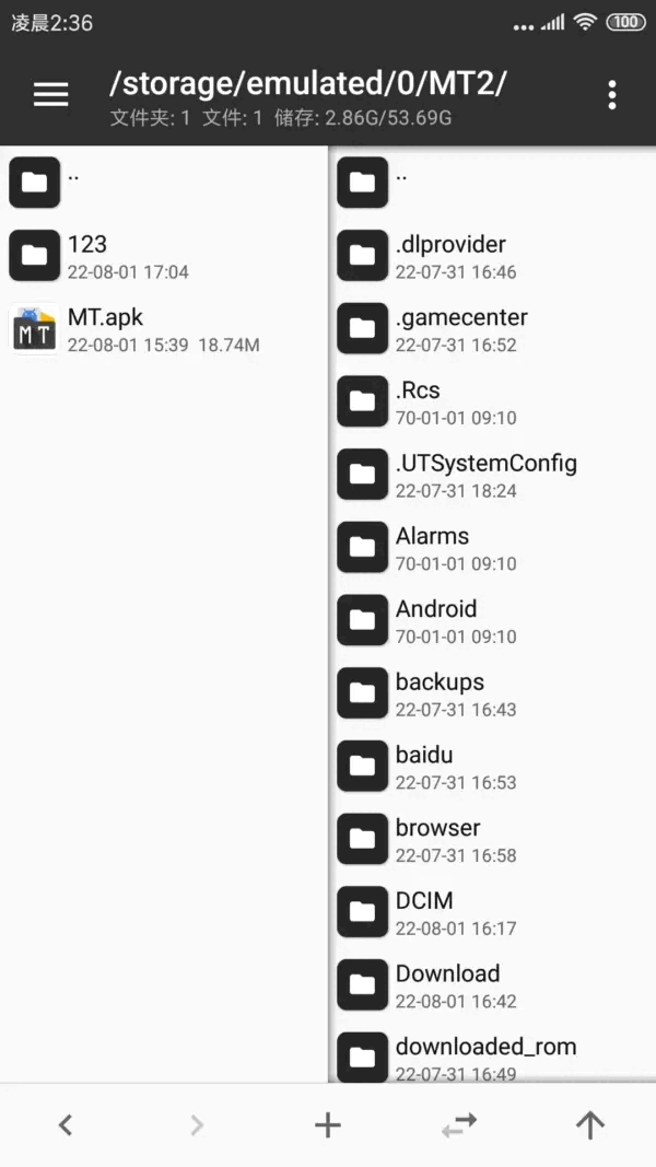 进入MT 管理器,首先看到的是左右两个文件列表窗口。