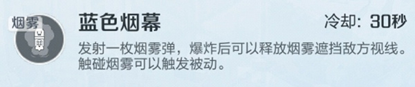 发射一枚烟雾弹,爆炸后可以释放烟雾遮挡敌方视线,触碰烟雾可以触发被动。