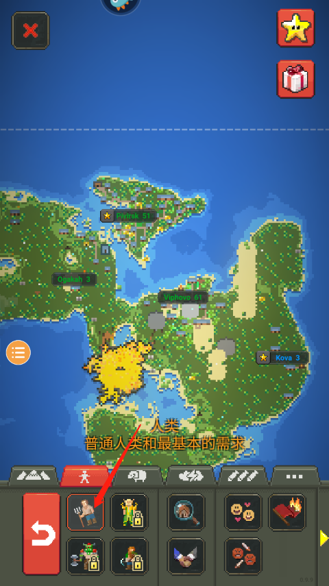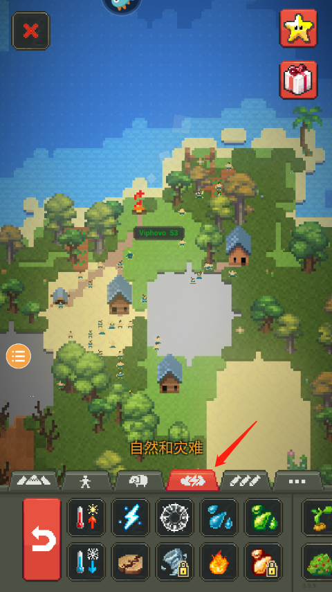 3、当人类数量放置够多之后,再选择一个部落村长进行繁衍,点击自然和灾难。