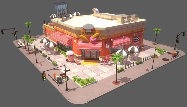细节设计:餐厅内部看不到,说一下外面,设置有黑白两色桌椅和遮阳伞,配合餐厅外部铺设不同色石砖,西方餐厅露天设计。半掩窗户配合红色遮阳棚可以阻挡光线,快餐厅内部一般设置有暖色吊灯可以给人极大温暖的感觉。