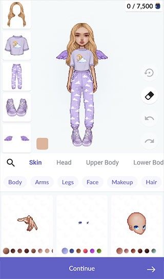 4、还可以为你的虚拟形象选择不同风格的包包,装饰完成后点击底部“continue”箭头!