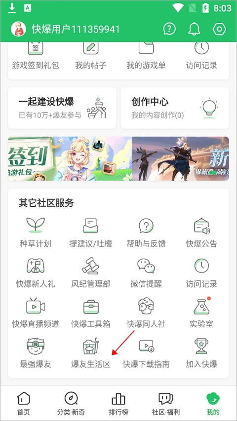 2、还可以进入【我的】页面中点击【爆友生活区】