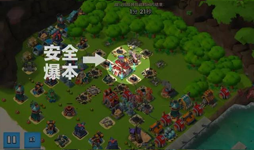 2、适合喜欢把资源辅助建筑放一起的对手。 案例进攻方案:最右侧贴墙登陆,路过狙击塔射程可放一个震荡。