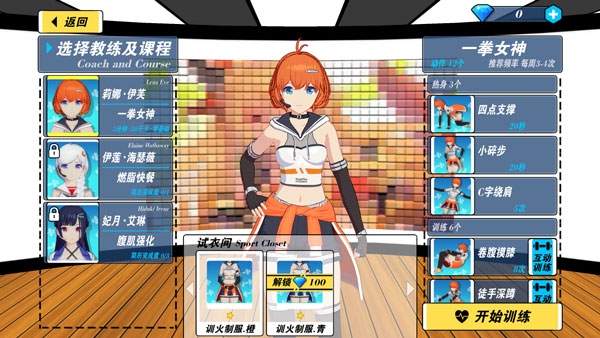 2、其中关于游戏玩法也非常的简单,每位教练都有着不同的训练计划的目标,如莉娜伊芙就有12种训练方式,其中包含热身项目3个、训练课程6个,还有放松计划3个。