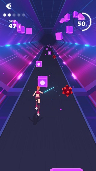 2、伴随着动感的音乐,长按屏幕左右移动游戏中的小人,使用小人手中的光剑切开飞驰而来的方块!同时要注意躲开所有障碍哦~