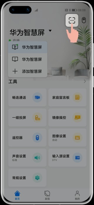 3、点击智慧屏App,首页右上角“扫码”图标,使用相同的华为帐号登录智慧屏,智慧屏App会自动添加该华为帐号下的智慧屏。
