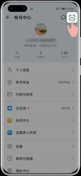 4、你也可以在手机桌面点击设置>华为帐号,点击右上角 “扫描”二维码快速登录智慧屏。