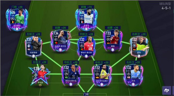 欧冠活动与四周年活动组合可以搭配出一套十分强力的451套装。锋线位置上,本泽马出色的跑动覆盖跟门前终结是前锋位置的不二之选。双前腰的选择上,可边可中的B席以及影锋式跑位的穆勒是最合适的人选,两个风格完全不同的前腰可以形成两种完全不同的进攻节奏。双边的选择上,可以单独爆一条边且能攻善守的科斯蒂奇与里肯共同出任,完美适配两个边前腰的战术能力。中前卫位置上选择B2B式欧洲金童桑切斯,覆盖面积广且具有足够身体优势的他可以有效连接两边,且也具备插上进攻和落位防守的意识与能力。