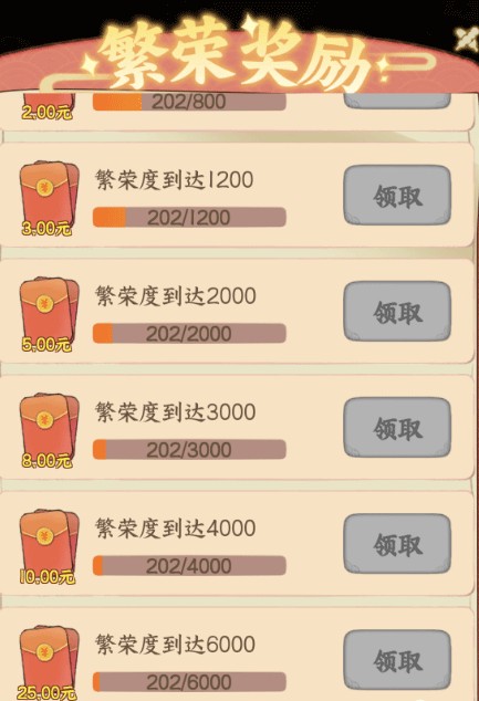 繁荣度达到指定的数额,还能直接领红包,红包收益从¥0.3~¥25不等。