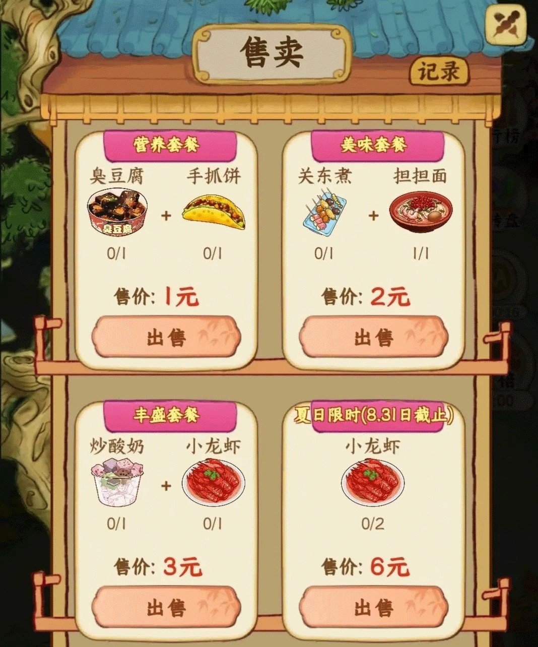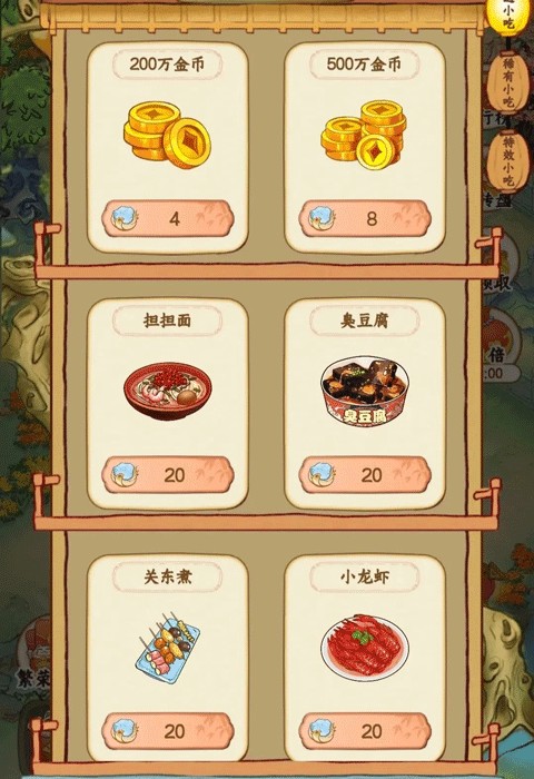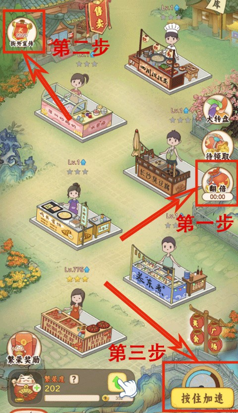 鸡蛋灌饼—>小龙虾—>炒酸奶—>臭豆腐—>关东煮—>担担面。先不要升级繁荣度。