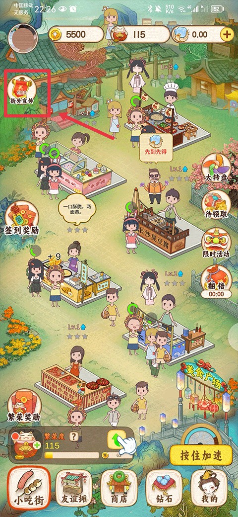 1、在小吃街界面中,点击左上角界外宣传