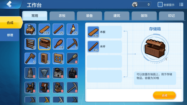 当大家从矿洞上来,满载而归的时候,是不是有时会遇到包裹已满的尴尬处境。这时,我们就需要去工作台,合成一个甚至数个储物箱来缓解自己的行囊啦!
