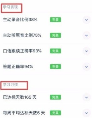 主动录音和主动听原音(25%以上为完美):需要在学习过程中,主动的点击小喇叭和话筒按钮进行主动听和主动录音,就可以提高相对应的比例。