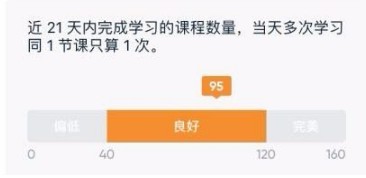 学习课程数量:这是近21天的累计数据,一天当中同一个课程多次学习只算一课。可以每天都学几个game的课程,时间较短,同时复习+新课结合,只学新课较难达标。