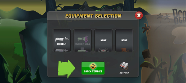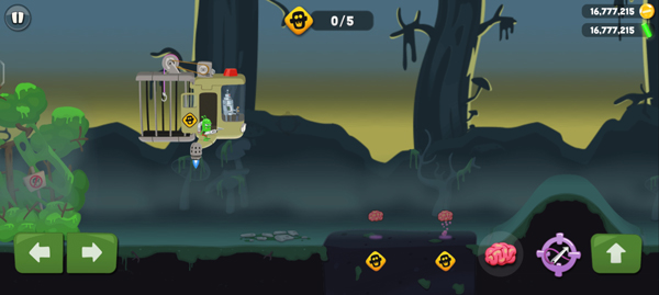 点击探查器玩家们就会进入到抓取僵尸的界面,初始的武器是一个可以进行攻击的刺刀。僵尸们一般被刺刀攻击到就会瞬间被气球给控制住然后升到空中,但是进入到地图的时候一开始是不会有僵尸在地图上出现的,这个时候有的沼泽当中会有僵尸的踪迹,需要玩家放置大脑去把僵尸引诱出来,等僵尸出来之后就可以用武器进行攻击了,能瞬间捕获僵尸。