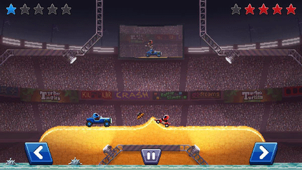 这款游戏的操作都是通过前后两个按钮控制的,只需要点击前进或者后退即可控制小车了~但是千万要小心,这里的车加速过猛是会翻车的,并不是简单的前进后退哦~