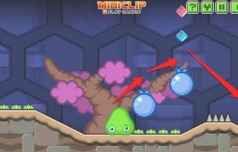 3、控制粘液跳到气球上,然后跳过钉刺,下面是没有办法通过的!