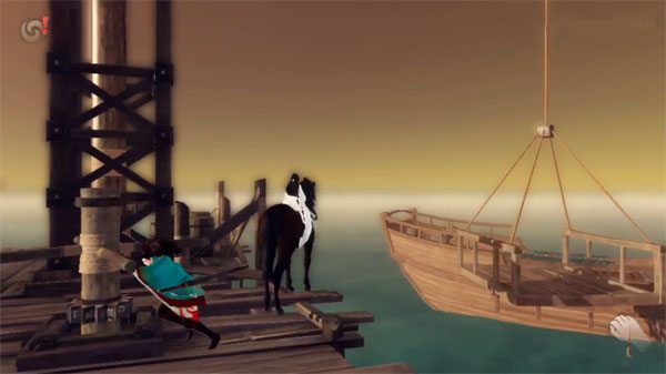 (小船并不靠岸需要主角将小璃和马想办法运送到船上)我们可以骑马上到木台子上面,此时就可以触发动画。