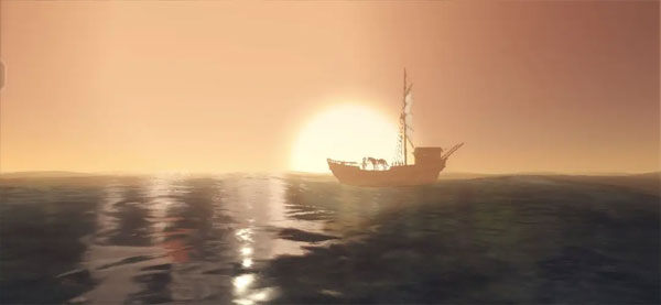 主角来到船尾,就可以看见图标变成一个船桨,点击就可以开启小船,左手前推小船前进,右手则可以控制小船的视野视角。