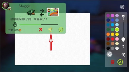 1、在画完每幅画之后,都会摆在桌子上让npc购买,npc出的价格有高有低,想要自己的画得到满意的价格,就要点击下图中的天平来进行讨价还价。