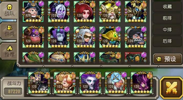 2、点击希望其参战的英雄,即可编入队伍。最多可选择五位英雄。经典阵容为:1前排+2中排+2后排,后期有新英雄加入后,可根据英雄技能特点,自创出各种新奇阵容!