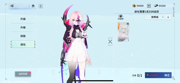 3、升格是消耗同名角色,SR升到SSR需要四个同名角色。但升到SSR之后就不能升格了,需要去点进化。进化就比较舒服了,只需要是同等级稀有度的都可以当作材料。至于后面进化的方向和级别还暂未了解。