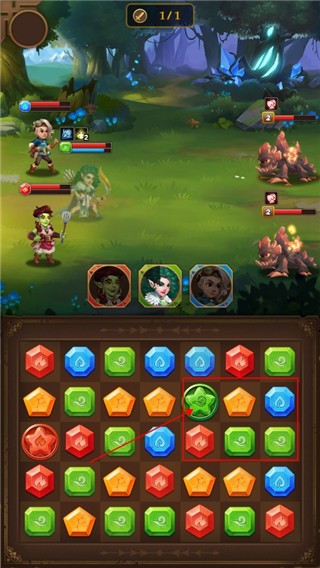 1、三消拼图:游戏的核心玩法是三消拼图,玩家需要通过交换位置,将相同元素的方块消除,完成关卡目标。消除方块时会获得能量,用于释放英雄技能和攻击敌人。