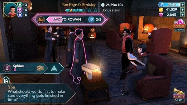 1、本演练将从一名二年级学生的角度介绍游戏。由于一年级及以上的学生可以参加冒险活动,因此根据你当前的主要故事进度,某些任务的星级和属性要求可能会有所不同。一旦你到了那里,你就可以和一些学生互动了。点击他们上方的演讲气泡,看看他们要对你说什么。之后,邓布利多会告诉你海格的生日很快就到了,他希望你帮他组织一个惊喜派对。
