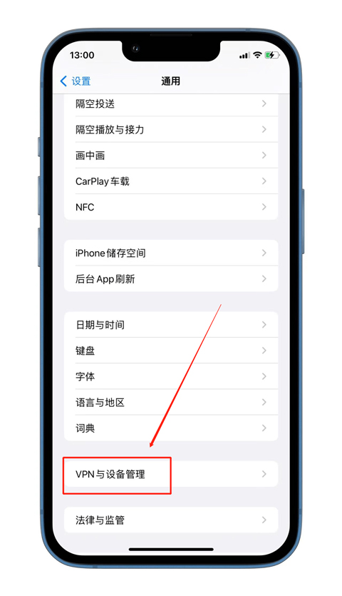 2、下载完该软件后,打开你的苹果手机的设置,进入通用,点击VPN与设备管理。