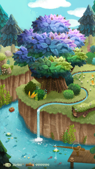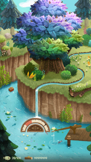 2、划到左边的页面就可以开始收集小鱼和木头了