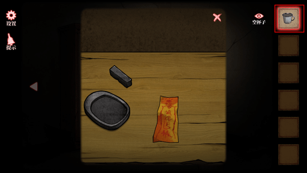 4、下面就是破坏子符来避免山匪的追击,在右边桌子上获取杯子;