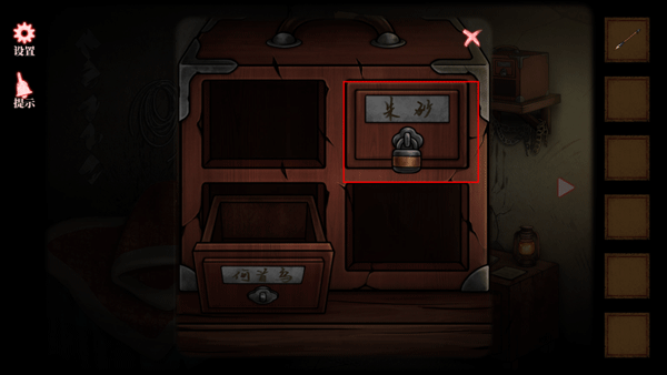10、再点击床头上方的盒子,会找到我们需要的朱砂。它是上锁的状态,需要钥匙;