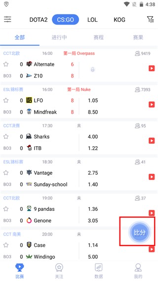 5、点击蓝色的图标,可以进行一个比分与指数的切换