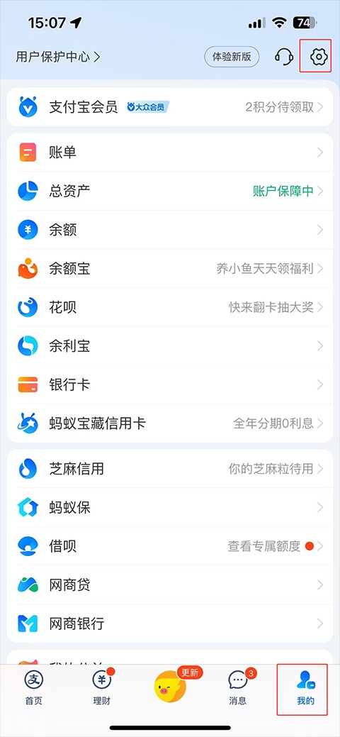 1、支付宝在个人中心页面,点击右上角设置图标。