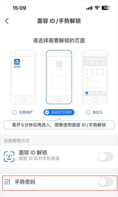 5、然后根据需要开启并设置面容ID解锁或者是手势密码解锁即可。