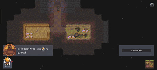 1、进入蚁群模拟器2中文版游戏后我们先来到蚂蚁巢穴来生产蚂蚁。
