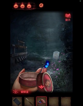 17、回到大门处,使用【胭脂盒】点击蓝***,获得【蝴蝶盒】,带着【蝴蝶盒】回到花园,放飞蝴蝶,蝴蝶会停留在花朵上,用物品栏中的【锋利铜尺】取下,获得【冥陀兰】。