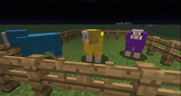 除了吸引羊群之外,小麦还可以用来促进羊的繁殖,羊的繁殖非常有趣——小羊会继承父母的羊毛颜色的一种,但如果父母的羊毛颜色是两种可以互相结合形成新颜色的品种时,小羊则会变成混合色,举例来说,灰色羊与白色羊可能生出浅灰色羊,正如图例。