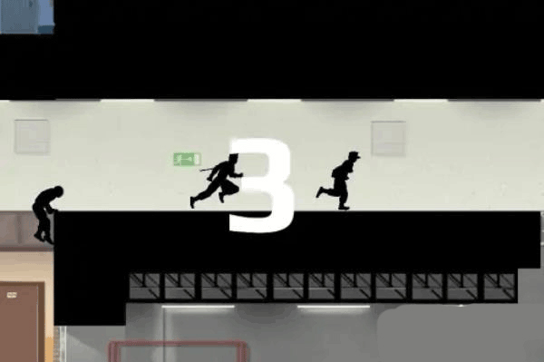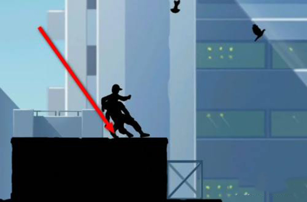 5、首先注意,主角现在这个位置的后面是一段加速的路,路的尽头是一个墩,也就是图中最左边那一点点高的东西(截图不完整),在这段路加速后差不多到墩的时候要向左划一下屏幕减速,然后跳刀墩上再起跳(图中的动作),去到前面那个人那段路,大概到那块公告牌的位置,向下划一下屏幕去到这关的第二个隐藏场景。