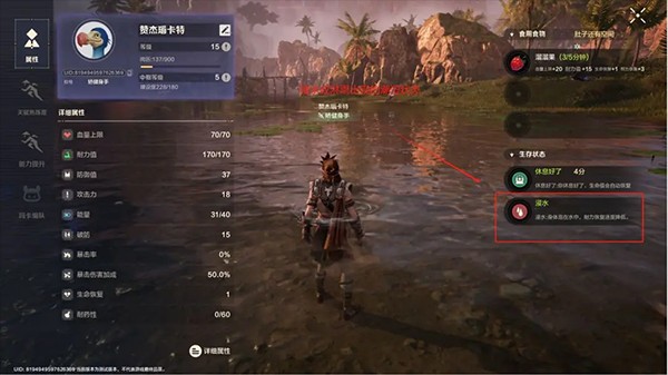 2、当左上角人物状态下方出现红色的图标时就代表角色出现了负状态,负状态会使角色的某些数值降低。就拿最常见的饥肠辘辘来说,导致该状态的原因就是因为太久没进食饿肚子所致,饥肠辘辘会使角色的耐力恢复和伤害降低,这个时候就需要进食来改善。除此之外在河里游泳会有浸水状态,而从水中出来或者淋雨则会进入潮湿状态。夜晚身边没有篝火的话还会有冷状态,长时间淋雨会导致风寒疾病等,这些负状态都会导致角色数值降低,因此出现时一定要及时改善。