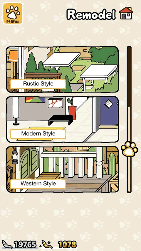 3、在你完成第一次扩建之后,玩家们依然可以继续收集鱼干继续扩建,扩建的方法和之前一样,当你点击商店的菜单的时候,会在菜单左下角出现类似于房子一样的标志,点进去后你就可以用收集的180金鱼干再次更换新的场景了。