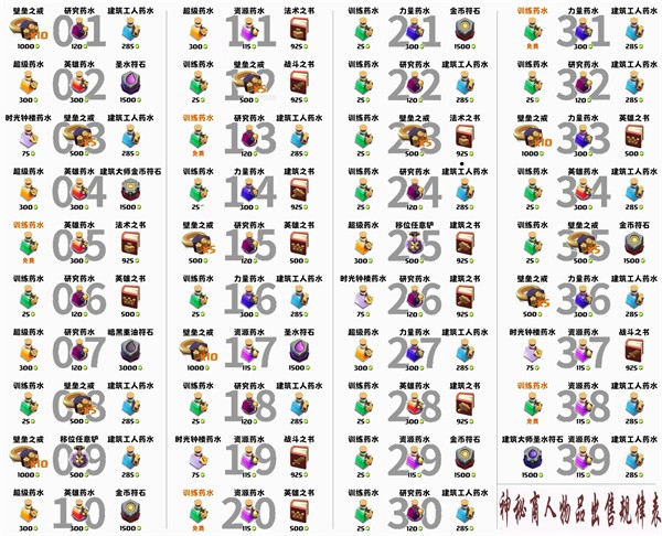 以下这张图是神秘商店每天的具体售卖的魔法物品的图表: