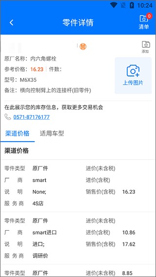 2、零件详情界面,显示渠道价格和技术信息。