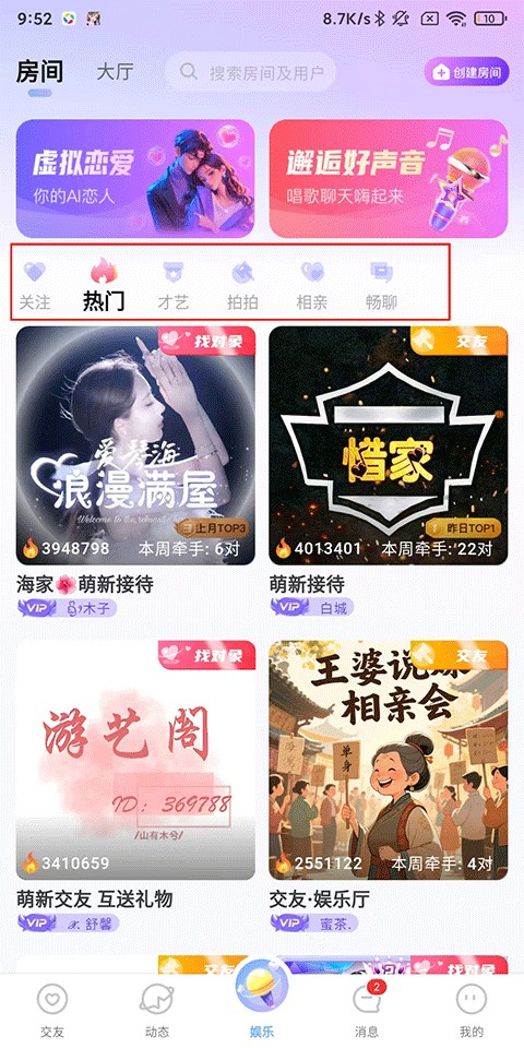 k歌大比拼、虚拟相亲、才艺展示、实时聊天,丰富的房间玩法震撼上线,总有一款适合你!