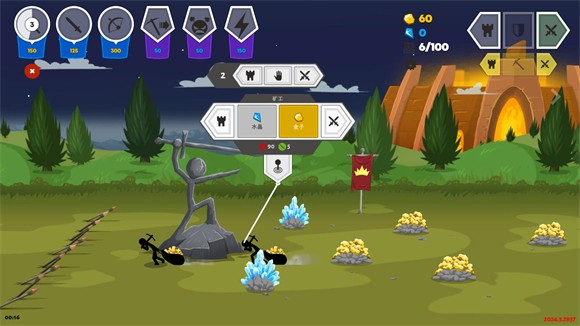 7、在对战中的资源是需要通过矿工来采集的,点击矿工可以分配他们去采集黄金或者水晶。