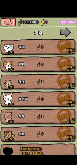 - 温泉的评价越高,能邀请的动物朋友就会越多,请招待所有动物朋友吧。