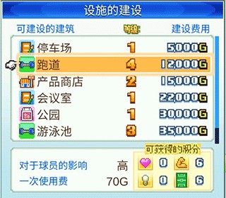 各种菜单中都需要的点数。参举行比赛或利用设施可以积累点数。教练和设施的能力对获取点数很重要。