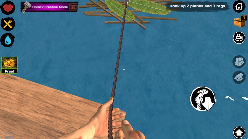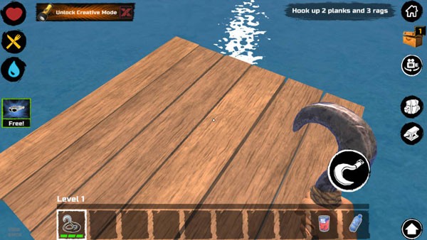 最初的游戏阶段,你出生时只有一个小木板作为活动空间和一个钩子。鲨鱼会不定期来攻击你的木板,如果你选择不抵抗,它会不停地咬,直到把一块板子咬烂为止。所以,你必须尽快利用钩子收集资源。水上的资源大致分为四类: