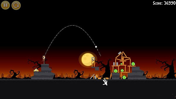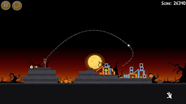 1-13:第一个回旋鸟按图中轨迹击溃建筑整体(有一定几率一鸟全灭),第二只鸟的位置跟第一只鸟差不多,只要击中位置网上一点即可,要确保左边的石砖倒向南瓜堆,一定要砸南瓜堆,否则无法三星!