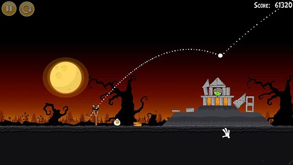 1-17:第一个炸弹按照图中轨迹首先摧毁建筑结构和南瓜(一定几率一鸟全灭),第二加速鸟非常重要,需要准确击中右边的木条,让右边的建筑往左边倒!